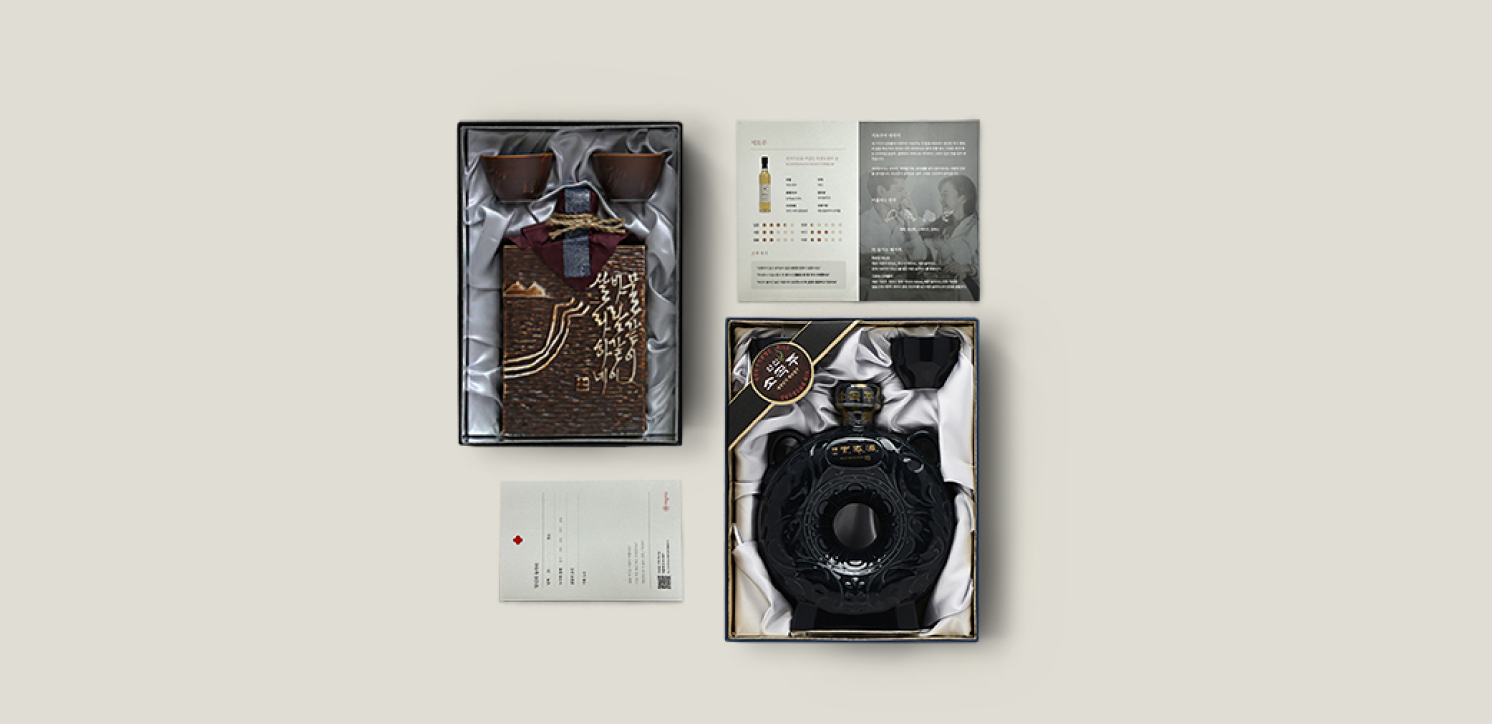 프리미엄 전통주 1종과 주문 제작된 술 잔이 구성되어 있는 선물 세트를 보내드립니다.